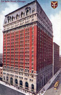When the LaSalle Hotel, designed by Holabird and Roche, opened in 1909, horses and stables still held their own in the streets of the city.  The 22-story-high, 1,000 room hotel was a true steel-framed skyscraper, but the Beaux Arts influence of the 1893 World's Fair still held sway.  The swank LaSalle was built to host presidents - both Taft Coolidge stayed here - and above and below 11 floors of Chicago School-like brick curtain wall enclosing the tight honeycomb of guest rooms, French Second Empire was chosen as the most appropriate design mode.  A massive Mansard roof capped the building's crown.