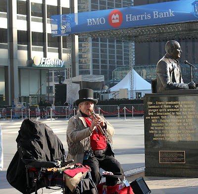 Friday's lone flute player will be augmented by a day-long schedule of concerts that culminates in the America's most admired rodents (and the progenitors of the corruption of U.S. copyright law.) leading the Tree-Lighting Parade that finds over a million spectators filling every available square inch of space on Michigan Avenue, resulting in human beings actually stacking themselves atop each other as parents raise their kids on their shoulders to try and see what's going on.